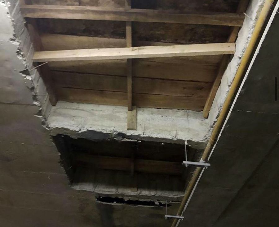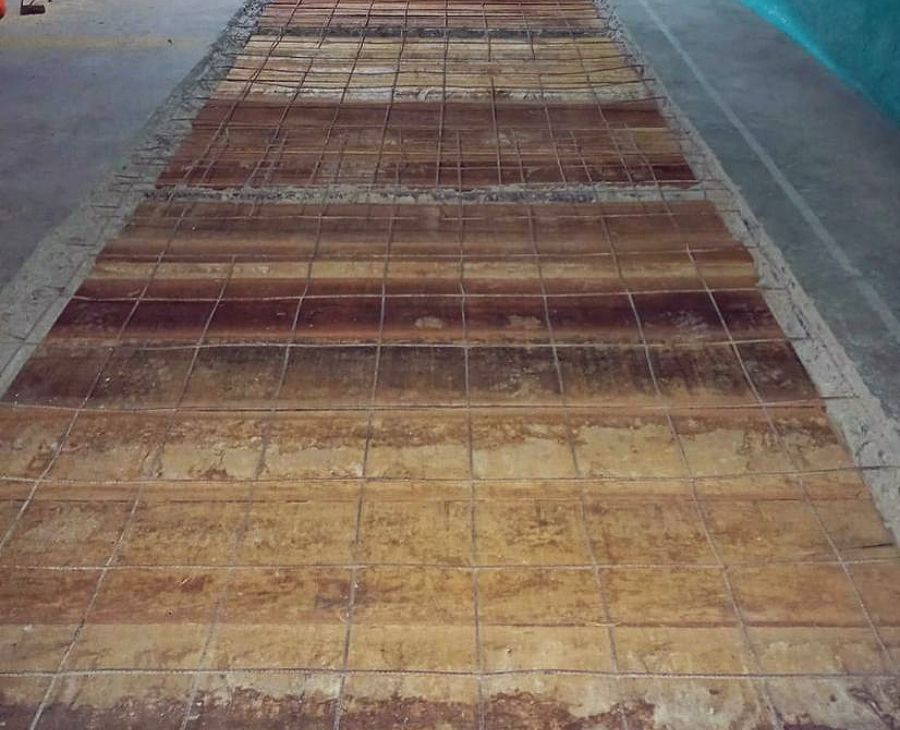 Se hace demolicion de la torta en concreto de losa de 5 cm de espesor arproximadamente con el mismo espesor en las vigas y nervios para tener un recubrimiento del concreto nuevo de reparacion, se aplica tabical para mejorar la adherencia de un concreto nuevo con uno existente, se instala malla electrosoldada y se arma nuevo caseton en madera, se vacea concreto Euconcrelisto 5000, concreto sin retracción.